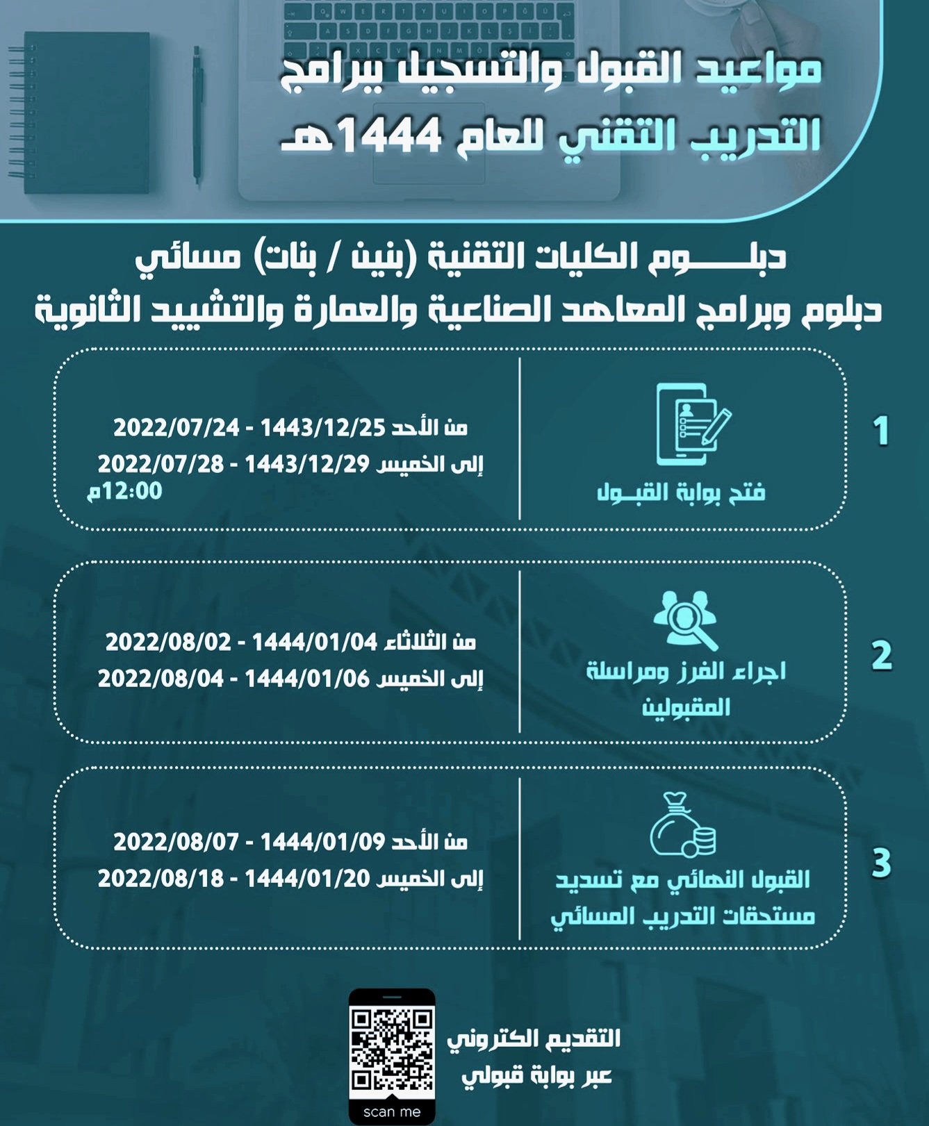 | دبلوم وبرامج المعاهد الصّناعيّة والعمارة والتّشييد الثّانويّة | الأحد | 25/ذي الحجة/1443هـ | 24/يوليو/2022م |